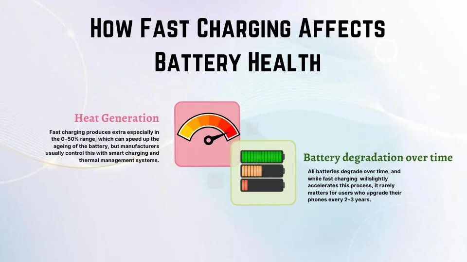 All battery degrades over a period of time regardless of their charging speed. Fast charging speeds up this process slightly, but the difference is usually minimal for average users.