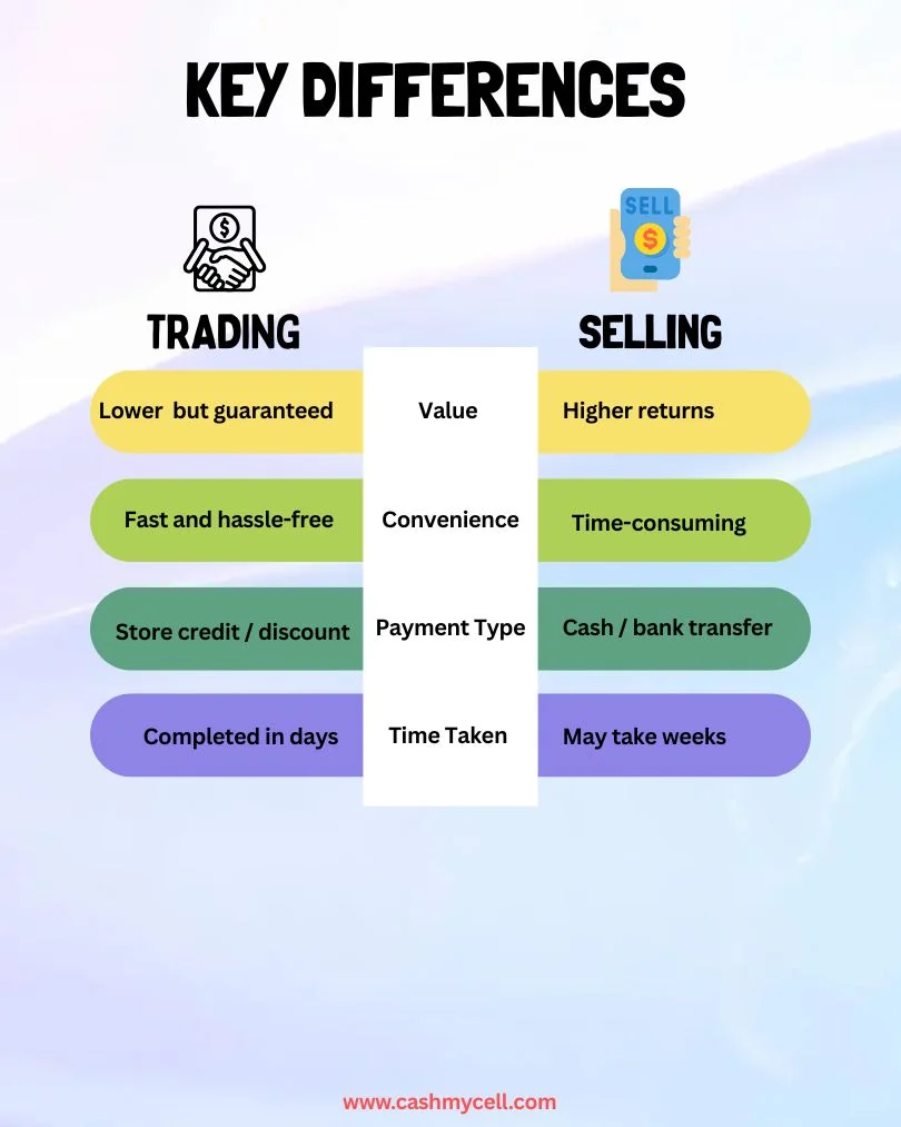 Selling always gives you better financial returns, especially for the newer or well-maintained phones. Trade-in phones provide you with a lower but guaranteed value.